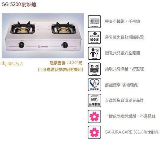 SG-5200 櫻花牌瓦斯爐整台不鏽鋼安全爐