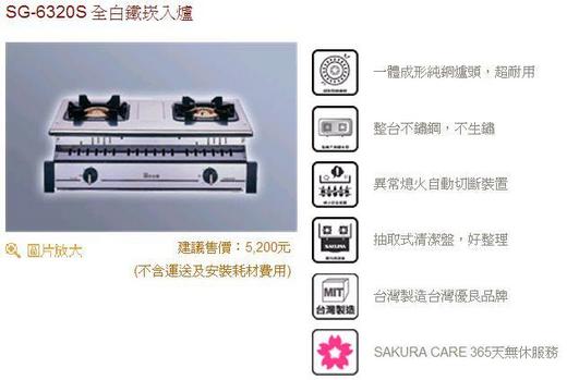 SG-6320S 櫻花牌瓦斯爐整台不鏽鋼安全 嵌入爐