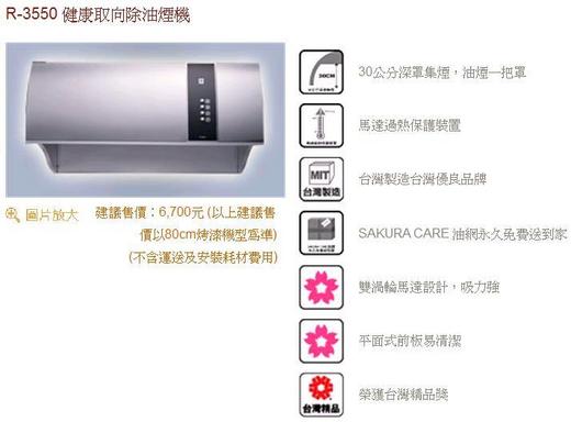 R-3550 櫻花牌排油煙機深罩式高效 80公分