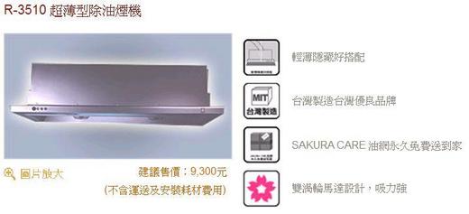 櫻花牌排油煙機歐式隱藏式90公分超薄銀色R-R-3510XL★送全省安裝