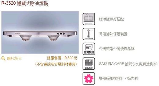 R-3520SXL 櫻花牌排油煙機歐式隱藏式 90公分超薄