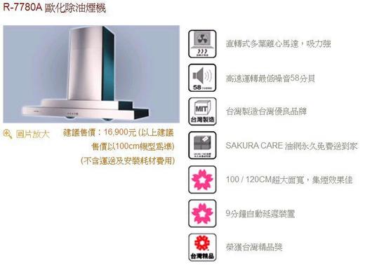 R-7780ASHXL 櫻花牌排油煙機歐式雙層T型 90公分