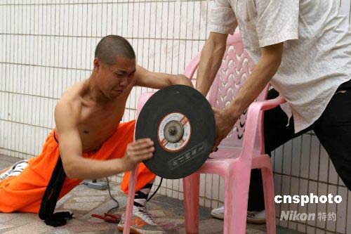 被上海大世界基尼斯總部評定為“中國鐵掌第一人”和“中國金鐘罩鐵布衫第一人”的中華武林奇人胡瓊,5月1日在廣東三水表演了手抓高速運轉切割機和電鉆鉆人體絕技。圖為空手抓停高速運轉切割機。中新社發