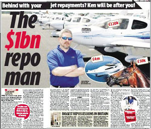 肯對記者稱,他和公司成員——包括兩名飛行員是從佛羅裏達州勞德戴爾堡的一處私人機場上強行“沒收”這架私人飛機的。接下來,肯會按銀行的要求以至少250萬英鎊的起價將這架私人飛機進行拍賣,然後他會從拍賣收入中提取一筆異常豐厚的“討債傭金”。
