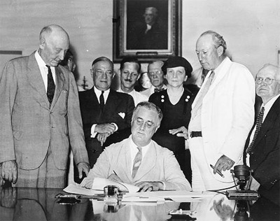 “合成人物”才能想出這樣的“雜種”辦法。盡管國會否決了征收遺產稅的議案,並削減了高薪階層的所得稅額。但是在那屆國會上,羅斯福的多數關於社會保障的提案還是通過了。後來,羅斯福回憶,為實行社會保障而努力奮鬥,特別值得自豪,社會保障法也許是他在立法方面最大的成就。但是,打贏那場惡仗實在是太不容易了。