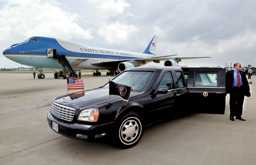 飛機:“空軍一號”。波音747-200型,還有一架完全一樣的備用機。世界上技術最先進的客機,價格近5億歐元,重400噸,有80臺保密電話。23名機組人員,可搭載70名乘客。機上還有一個緊急手術室,也可當作軍事指揮所使用,飛機上永遠有一名帶著“足球”的助手。