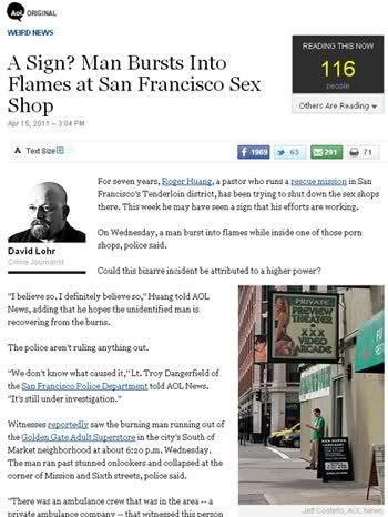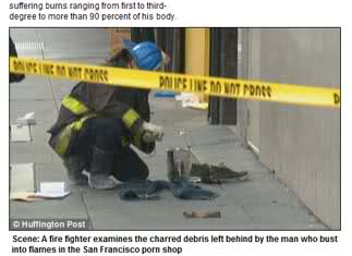 欲火焚身是形容人在性欲高漲是,渾身有似被烈火燃燒般的沖動;但在美國舊金山,有一名男子真的在成人商店內欣賞A片時,看到全身著火。雖然消防員立即趕到現場把火撲滅,並將男子緊急送醫,可是他全身已有90%叁度燒傷,當前仍未脫離危險期。