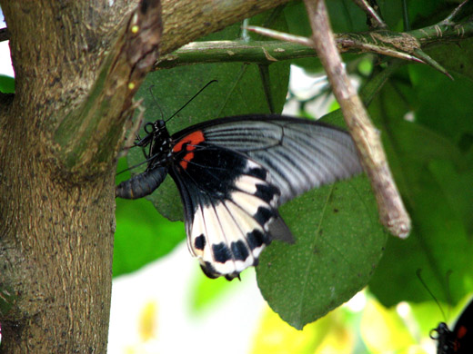 大鳳蝶...雄蝶只有一種外觀, 就是藍色的翅膀表面, 腹面的後翅基近腹部處, 有小塊紅斑 (第一張照片, 沒辦法貼腹面角度的照片, 只能貼三張)
