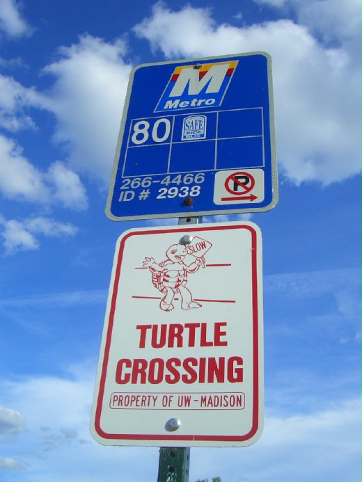 校園車流量日增之後,能在馬路虎口餘生的烏龜,絕大部份是靠路人幫忙過的馬路。然而比起十年前我們剛到這個校園時的盛況,這兩三年來路上烏龜幾乎絕跡了。是這個警示牌立得太晚了嗎?還是烏龜另尋到活路,重修了祖先流傳下來的路線圖?
