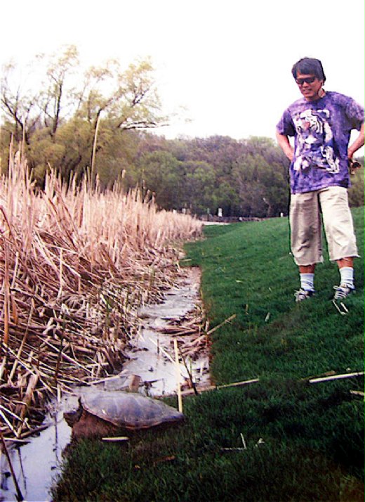 這種龜綽號 Snapper,我叫牠咬人龜。有的時候龜才剛從馬路邊緣開步走,公車司機沒時間等,乾脆離座下車, 兩手端起咬人龜“替”牠過馬路。只見司機一邊左閃右躲牠的利嘴、一邊三步併兩步把烏龜送到水邊。這時,在公車裡伸長著脖子觀望的大學生和研究生們就會報以一陣熱烈掌聲,跟小學生一樣,可以為看了這一場熱鬧一整天都開懷。