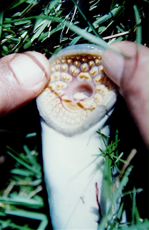 五大湖的湖鱒是吸血鰻的主要宿主,這幾年來當局打擊吸血鰻成效卓著,要一睹牠的真面目並不容易。照片裡的這隻吸血鰻掛在密西根湖的鮭魚身上不知道已經多久,直到這隻鮭溯游到米爾瓦基河時被我們一起釣上來。扯下的鰻在地上亂竄,教圍觀人眾雞皮疙瘩掉一地;釣上來的鮭則因為身上有鰻的血盆大口留下的瘡疤,也教釣魚人倒盡胃口。
