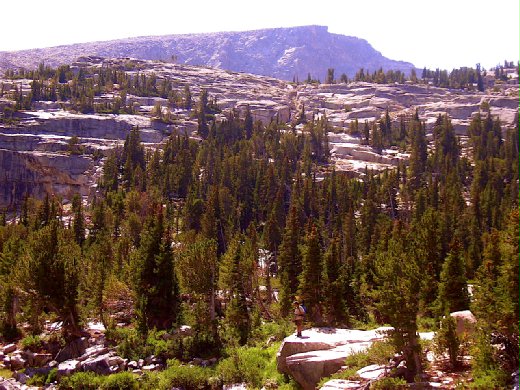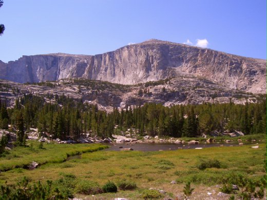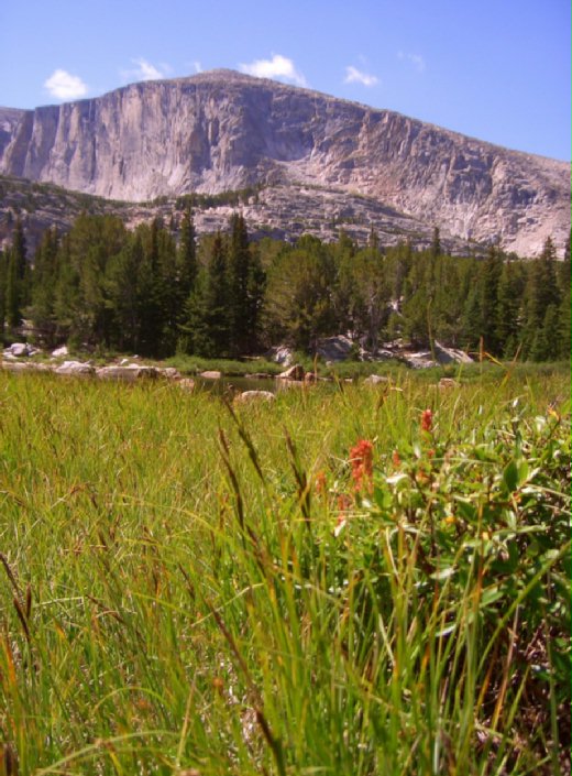 (圖:Popo Agie Wilderness near “腳湖” Leg Lake at Lander, WY. 圖中後方的大岩牆就在腳湖畔,是Pete 發生意外的地點。一場悲劇,不僅是藍德鎮失去一個家人與朋友,投石的年輕人也失去:才剛從伊拉克戰場生還的他,在瞬間失去重新出發的立足點。)