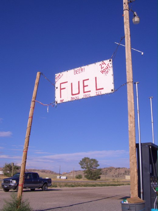 像這一條路,兩旁全是沙丘和石頭山,與對面來車相逢的間距平均1英哩 ,撞見動物與撞見人的機率比大約是25:1。因此,當看到道旁出現這樣簡陋的24 小時的加油站時,好像看到希爾頓飯店一樣,非得回轉車頭去拍張照片不可!