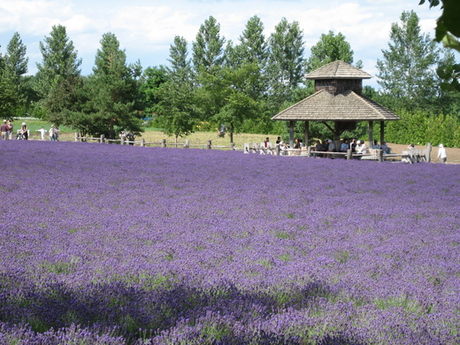 當然就要選在北海道薰衣草盛開季節造訪..我們到北海道很少看到人山人海的景象,那天在富田農場裡就見到薰衣草的魅力。我們還在通往富田農場的路上,先看到不是盛開花田而是正準備進入富田農場的車陣,等我們一行五人抵達停車場時,還誤以為我們回到台灣...因為你又可以聽到熟悉的國台語交錯著,我想在場有一半以上都是台灣觀光客吧!