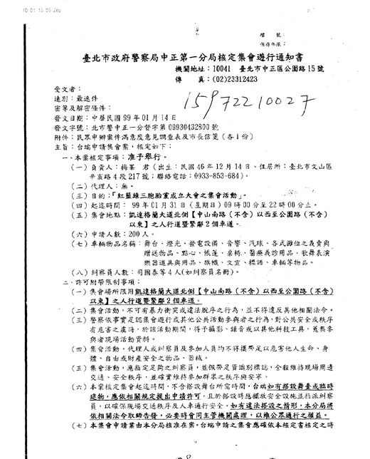 受文:台北市政府警察局中正第一分局收受並代轉台北市政府警察局