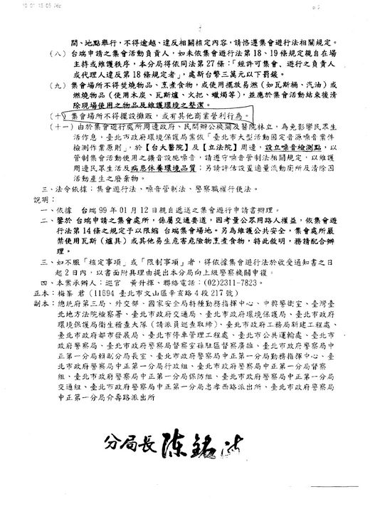 三、陳銘政在限制事項第十款說:「集會場所不得擺設攤販,或有其他商業營利行為」,申請人要請問法源何在?如果是根據《集會遊行法》第十四條第三款:「關於維持交通秩序或公共衛生之事項。」則申請人要請問,「商業營利行為」與「交通秩序及公共衛生」有何關係?搭棚設攤妨害到什麼「交通秩序」與「公共衛生」!至於場地之清理,恢復原狀等「公共衛生」事宜,這本是申請人該盡之義務,不勞你陳銘政多管閒事來費心,你好好管好自己與自己的屬下就好了!