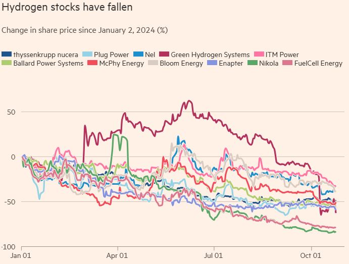【後註一,2025/01/06】幾天前,我在博文《雷達與隱身技術之間的矛盾關係(下)》的留言欄提到,美國氫動力公司Hyzon在主管特地針對投資人搜刮最後一筆之後正式倒閉(參見《Hyzon Executives Sell Remaining Shares as Dissolution Vote Looms》)。雖然在氫動力創業公司之中,Hyzon只能算是一隻小蝦米,然而從下圖(來自《Financial Times》的這篇《US and European hydrogen stock prices collapse as prospects deflate》,顯示了歐美最大的11家氫能公司股票價格在2024年的走勢;作爲對比,美國S&P 500指數在2024年整體上漲了25%),可以簡單看出氫動力資本騙局已經早於核聚變和量子計算,先行進入收官階段。有興趣的讀者還可以參考Sabine的最新節目《Hydrogen Hype is Dying, And Thats a Good Thing》,印證十年前就已經可以閲讀本篇正文而輕鬆獲得的先見。我對揭穿核聚變和量子計算騙局仍然抱持審慎樂觀態度,正是源於Ponzi scheme(龐氏騙局、又稱老鼠會;例如至今所有量子計算公司的那一丁點營收,仍然100%來自對後續老鼠團隊的販售,完全沒有任何實際應用)不可能無限持續,而群衆面對最終事實獲取後見之明,遠比我努力傳播先見、試圖教育他們要容易得多。當然,若想進一步扭轉中國學術界的腐朽文化,比起揭穿個別騙局又要艱難好幾個數量級,但國家興亡原本就取決於好人與壞人之間不斷鬥爭的結果,後者勢大不是我們放棄的藉口,反而是更加奮起負重前行的理由,這正是“士不可不弘毅”的道理。