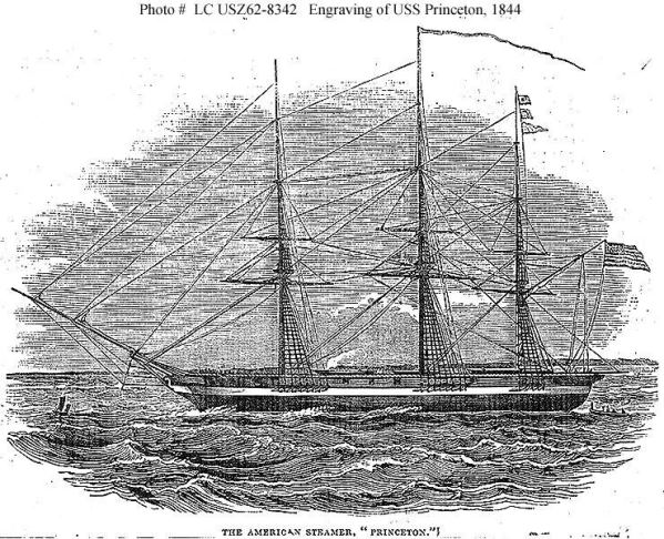 USS Princeton在1843年九月開始在名義上服役,在十一月進入正式執勤,但是一直到1844年一月才接收了前述的兩門主炮。然後在二月27日,一直鼓吹建造大海軍以參加殖民競賽的Tyler總統受邀檢視USS Princeton;一同來訪的還有國務卿Upshur、海軍部長Gilmer、前總統Madison的遺孀、一衆國會議員等等。