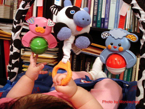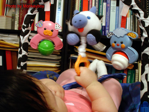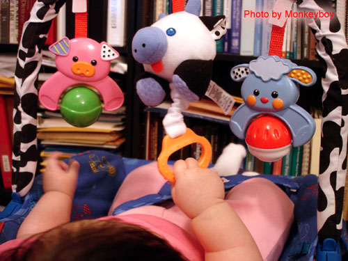 五個月大的阿寶武功進步神速,從一開始的「聲東擊西」、左右逢「圓」,現在已經練到第三式「阿寶牧牛」。只見她左手掌往外畫圈推出,右手兩指扣住中間小牛娃娃的拉環... 一拉一扯之際,叮叮咚咚的音樂傳出,奏起「王老先生有塊地啊~伊呀伊呀唷~」的旋律... 好玩極了!