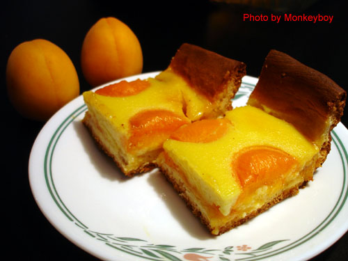 麵糰做好後,以桿麵棍整型,平鋪在 9"x13" 的烤盤。先抹上一層杏桃果醬,倒入奶油餡之後,放上九個切半去核的杏桃,放入烤箱以 375F 烤 25-30 分鐘即可。