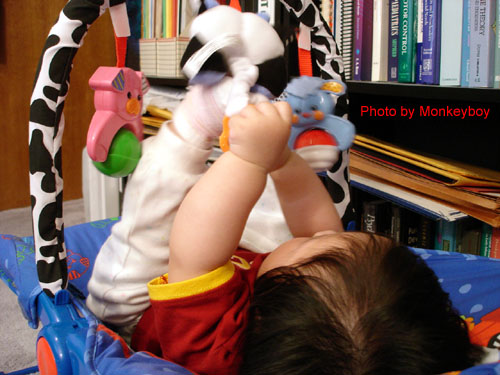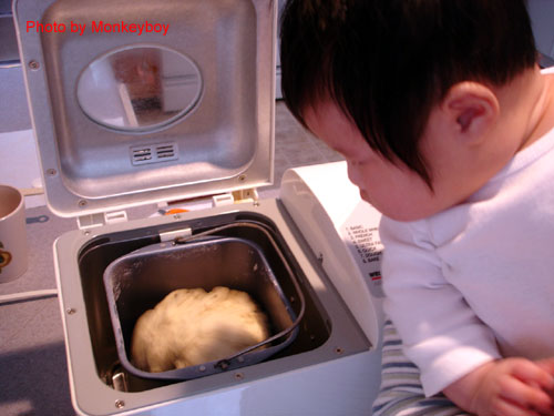 照片插播:小阿寶視察麵糰製作過程,目前她對任何會旋轉的東西有興趣。之後又陪她練功,現在的阿寶,已經可以手腳並用,對著口黏的阿菊... 不對不對,是「小牛娃娃」拳腳交加,伊啊伊啊唷~