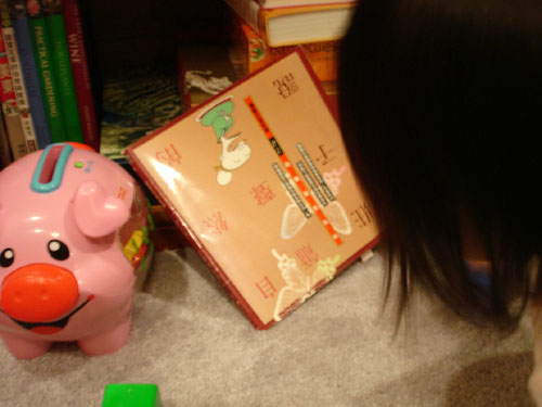 小阿寶目前十一個月大,已經會扶著傢俱到處走,見渺小微物,必細察其紋理,故時有物外之趣。她喜歡摹仿爹地媽咪用電腦,尤其對會發光的滑鼠深感興趣。她也愛點閱書櫃,然後一本一本扔掉,身為爹地的我,也只能隨時撿拾整理。