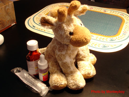 女兒得到一隻長頸鹿娃娃,護士阿姨送的,得獎原因為「哭聲最大」![]()