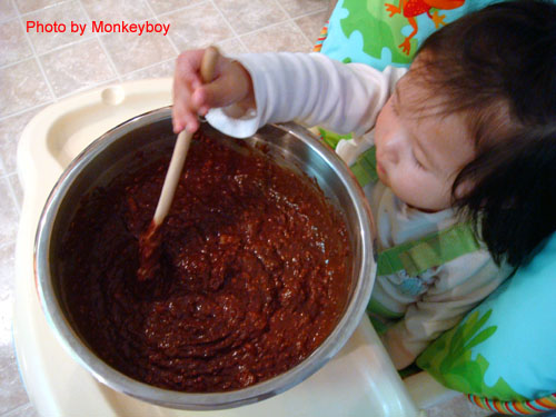 ... 把麵糊與木湯匙交給小貝果,她會興奮地學爹地「和麵糊」。