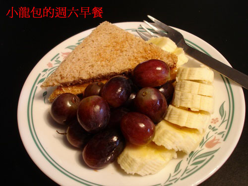 倆倆相疊的三明治、薄薄香蕉片、以及上選葡萄,是小龍包的早餐。