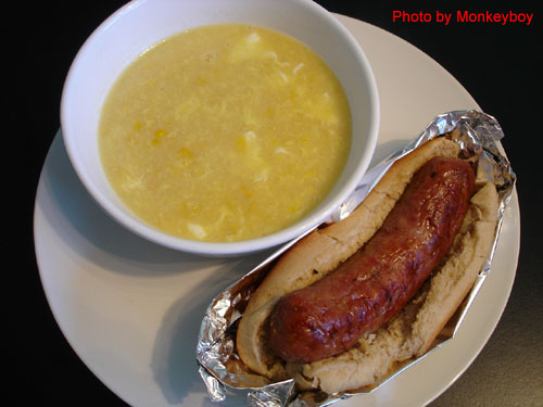 生菜水果沙拉、玉米濃湯,加上香噴噴的 bratwurst (德國香腸)。