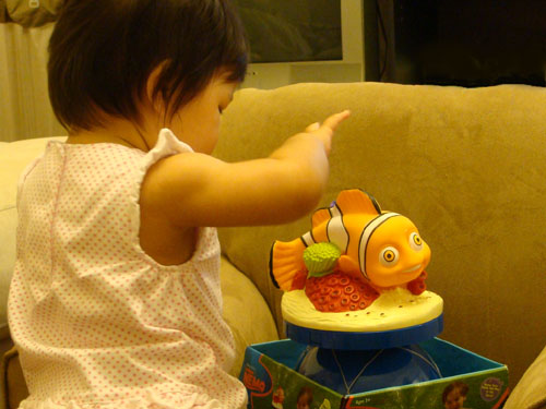 好朋友「月半嬸嬸」也來共進晚餐,為美乃滋慶生,送了一個 Nemo 玩偶,接上水管後,魚兒會旋轉並噴水。隔天在院子裡試噴成功,大家玩得「水噹噹」。
