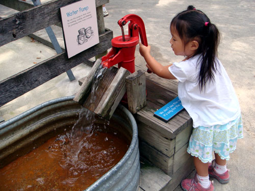照片裡的小貝果正忙著汲水,準備澆花及餵小牛。