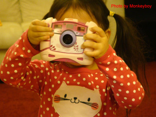 只見她興奮地著瞄準爹地,按下快門,完成第一項作品。