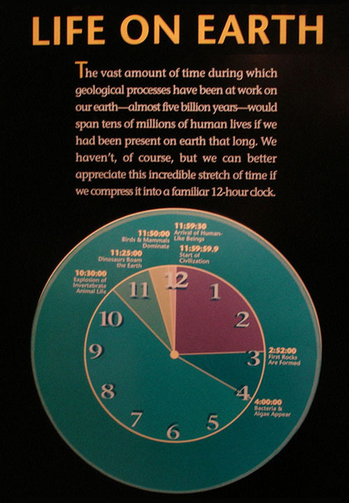 如果將地球的歷史縮減成一個 12 小時的時鐘圖,有人類的部份,僅佔了零點一秒鐘,這短短的歷史竟然可以把地球推向不可挽回的毀滅之路,這樣的破壞力真是歎為觀止啊!