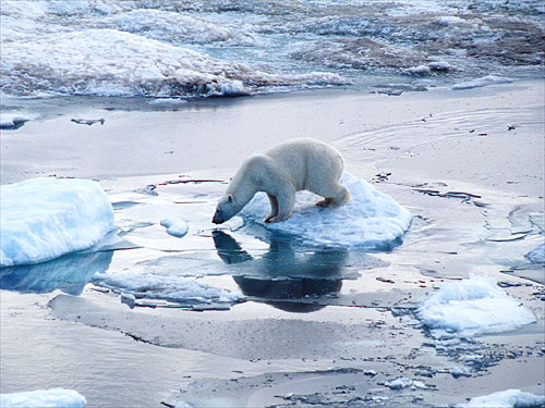 因為溫室效應造成海水溫度升高,北極圈已經逐漸融化。首當其衝受到影響的是北極熊,他們現在得多游二三十哩才能到另一塊冰原覓食與休憩。