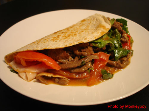 置入墨西哥玉米薄餅 待熱氣透過餅皮 發出滋滋聲響