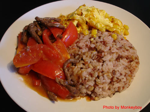 註:昨天吃的「金玉滿堂蕃茄牛肉燴五穀飯」做法