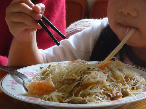 圖二:小貝果拿起筷子,津津有味地吃著奶奶親自下廚的炒米粉。