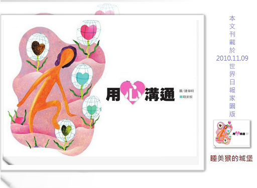 謝謝來訪,祝闔家天天開心。 Monkeyboy 於 2010/12/16 01:21回覆 - 1樓. 熏衣草2010/12/14 01:22用「心」溝通