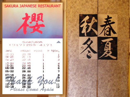 Sakura 就是優質餐廳之一,位於印州首府,開車要好幾個小時。所以只要有機會,小龍包和猴兒一定順道拜訪。我們還辦了 VIP 卡,可以消費集點數;卡的背面記載了用餐日期,兼具有回憶大事記的功能: