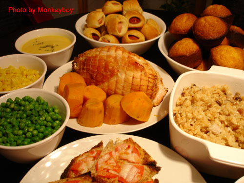 配菜有地瓜、玉米跟青豆,還有油飯 (因為不喜歡吃美式的 Stuffing,小龍包改做油飯)。