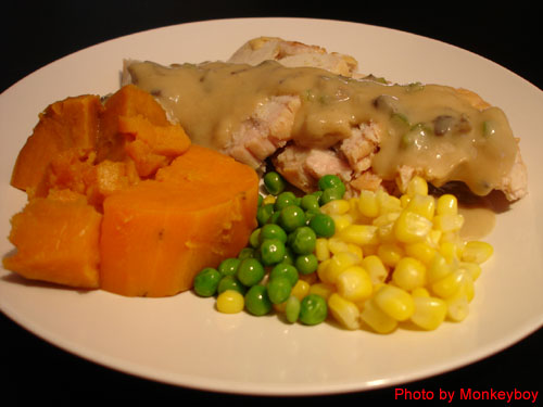 主菜是猴兒烤的火雞胸加 Gravy (雞汁加入了切碎的芹菜及洋菇勾芡),火雞只有三磅,烤箱設定華氏三百二十五度,因為沒有骨頭,半個多時辰即可出爐,味道還不錯。
