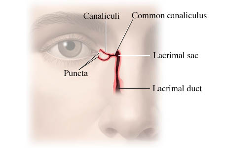 部分新生兒有鼻淚管阻塞現象,所以造成眼睛分泌增多甚至會淚眼汪汪。這種情況通常到嬰兒一歲前就會自然改善,此期間內可用按摩的方法幫助通暢,若超過一歲仍堵塞就請眼科醫師幫忙打通。由於鼻淚管的堵塞往往會造成結膜炎,一發炎眼淚就會轉成黃白色分泌物,甚至早晨起床由於分泌物之黏性往往會使眼睛打不開,此時最好請眼科或兒科醫師診治處理。鼻淚管構造 (Tear duct anatomy)