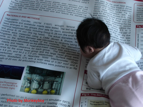 至於登台報告的部分,是由猴兒指導的「建教合作」學生 (co-op) 代勞。這位工讀生,今年二十一歲,就讀於凱斯西儲大學 (Case Western Reserve University) 醫學工程系大學部,認真勤勞,所以得到此榮譽。他出生於南韓,六個月大時,被一對住在馬里蘭州的美國夫婦領養,自此未曾回到韓國,受美式教育,卻有東方人謙和有禮的態度,真是難能可貴。