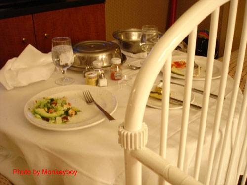 其中有一天,猴兒必須顧海報到晚上八點。回房之後,為避免小龍包餓昏,臨時動議後,決定直接點西式的客房服務 (Room Service),全員留守不外出。