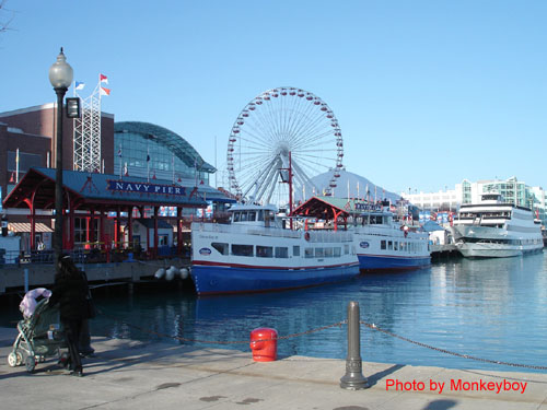 眼前出現一座十五層樓高的摩天輪,是碼頭上的大地標,建於一八九三年博覽會 (咦~爹地不知道從哪兒 google 來的)。從我這角度看上去,好壯觀!