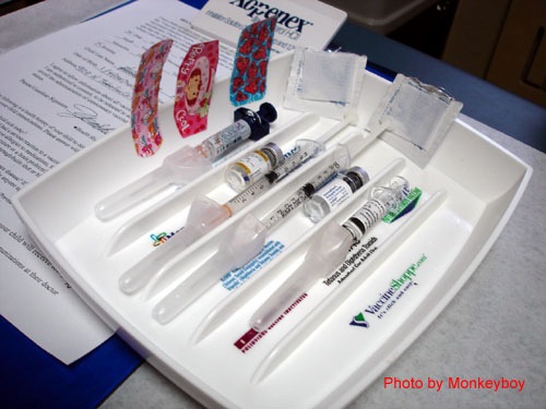 接著,媽咪伸出她的奶油桂花手,壓住我的雙臂,咿咿嗚咿咿~我已經開始尖叫了,媽咪好殘忍 (PS: 媽咪說她是打在兒身,痛在娘心,只有愛玩的爹地還一點都不手軟地四處照相!) 都不安慰人家!兩邊大腿各兩針,一共打了四針,嗚嗚嗚~好委屈喔~