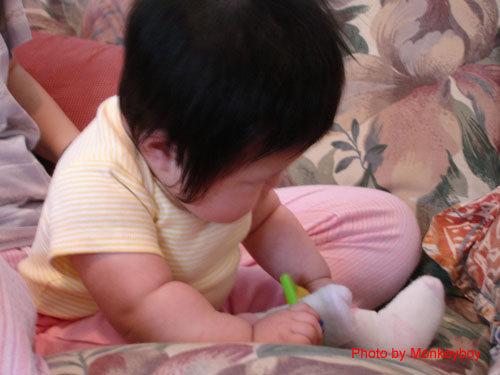 接著,媽咪很專心地跟醫生講話。依稀聽到什麼還不會翻身,什麼嘛!人家這麼胖,翻不動又不是我的錯!不過,我會三點式坐姿 (tripod sitting) 兩三秒;還會用拇指跟食指夾爹地的胸毛讓他痛的吱吱叫,可以加分,耶~