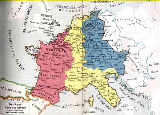老大較強勢,搶得中央部份,含北都亞琛及南部羅馬。兩個弟弟,分占東方的日耳曼〔德國前身〕,及西方的法蘭克〔法國前身〕。