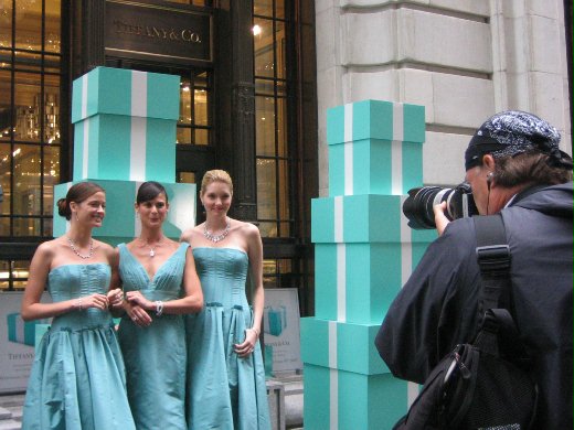 我以跑火警的速度,在半小時之後就出現在 Tiffany 門口。才走出華爾街地鐵站,馬上看到許多 Tiffany 美女戴著鑽飾,撐著藍色的傘,優雅地站在街頭微笑,整條狹窄的華爾街彷彿就是她們的伸展台。